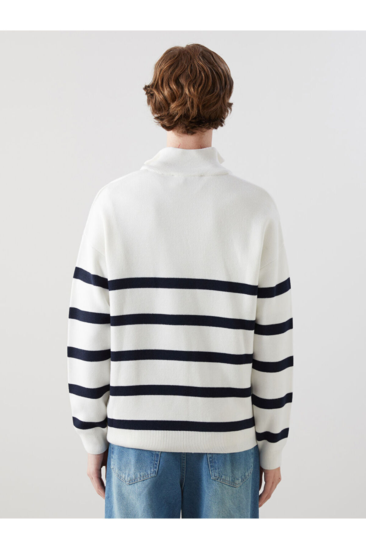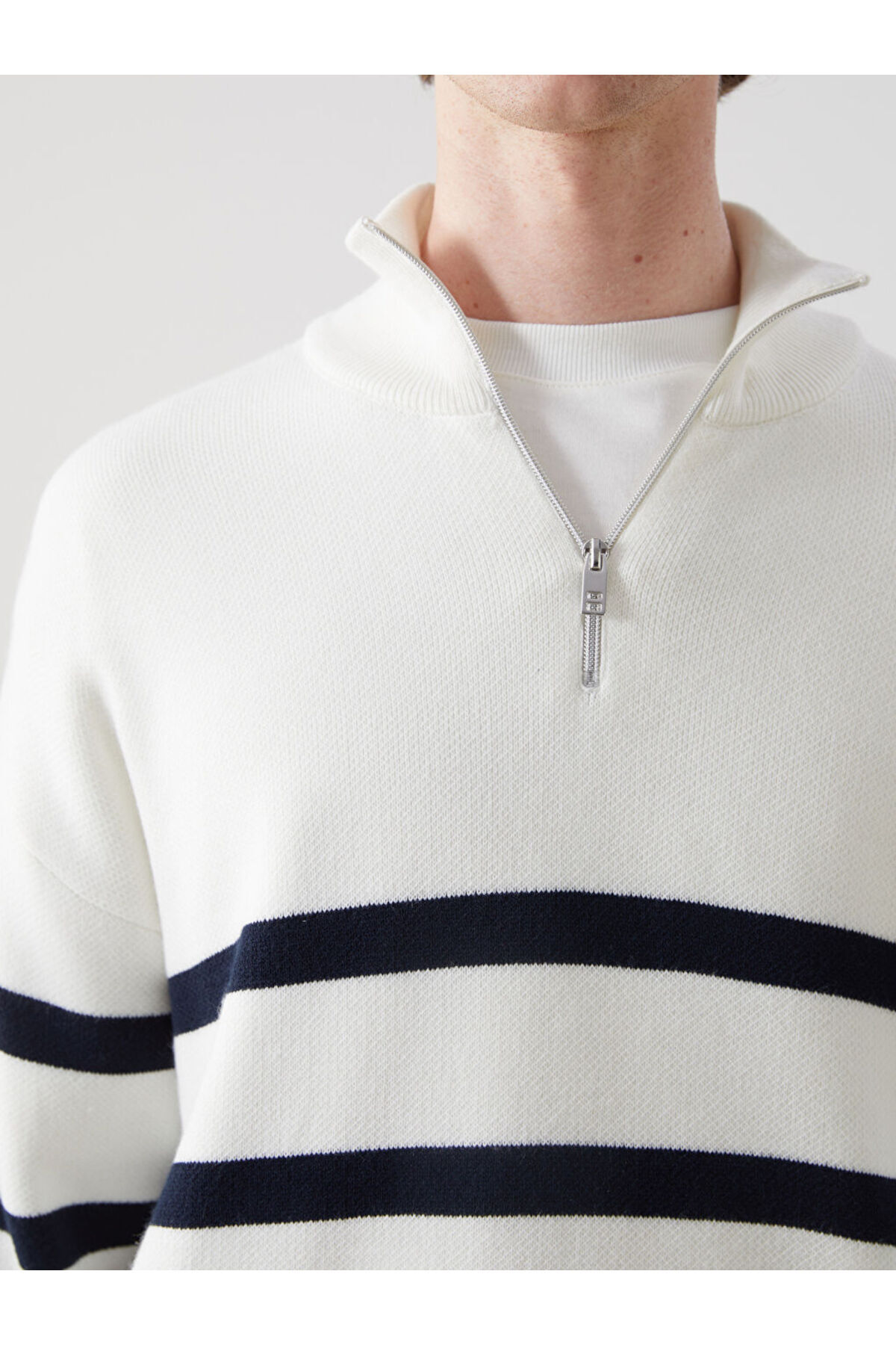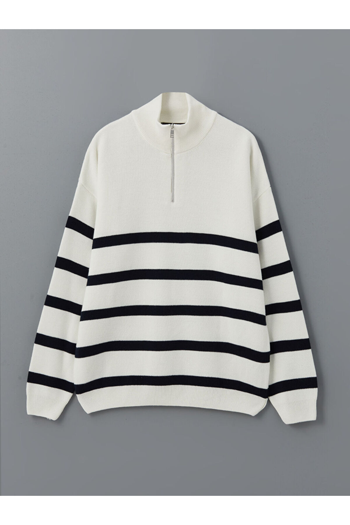 ژاکت بافتنی مردانه راه راه آستین بلند یقه ایستاده Ecru