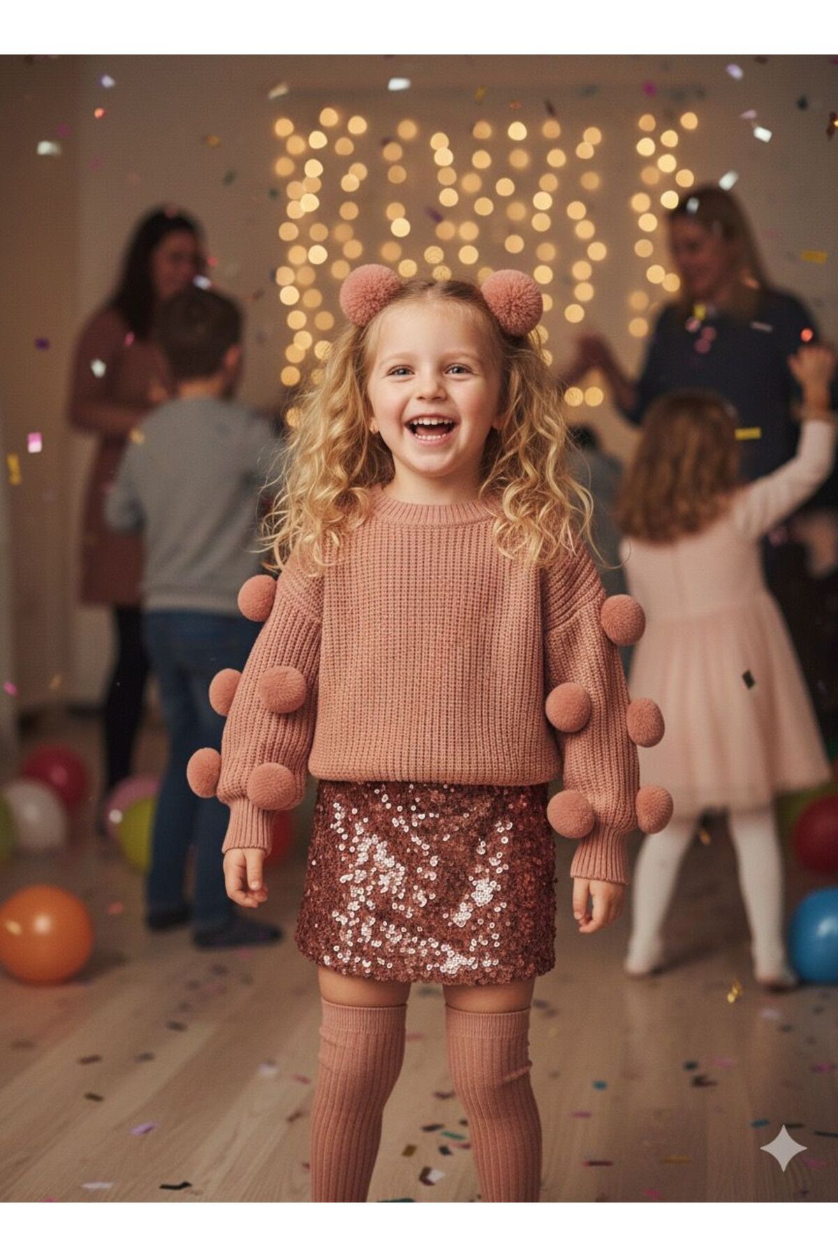 ست ژاکت و دامن پولک دوزی شده طرح شیر و پوم پوم قهوه ای دخترانه، سگک و جوراب، مناسب برای ۶ ماه تا ۸ سال