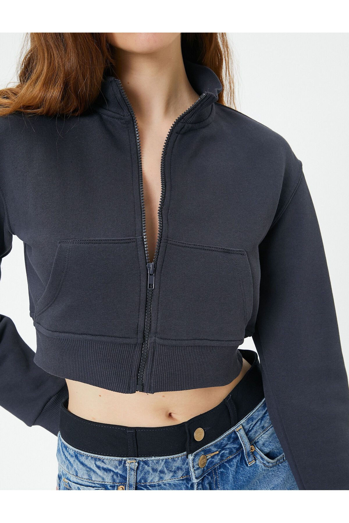 سویشرت زیپدار مدل Crop با جیب کانگورویی و یقه ایستاده