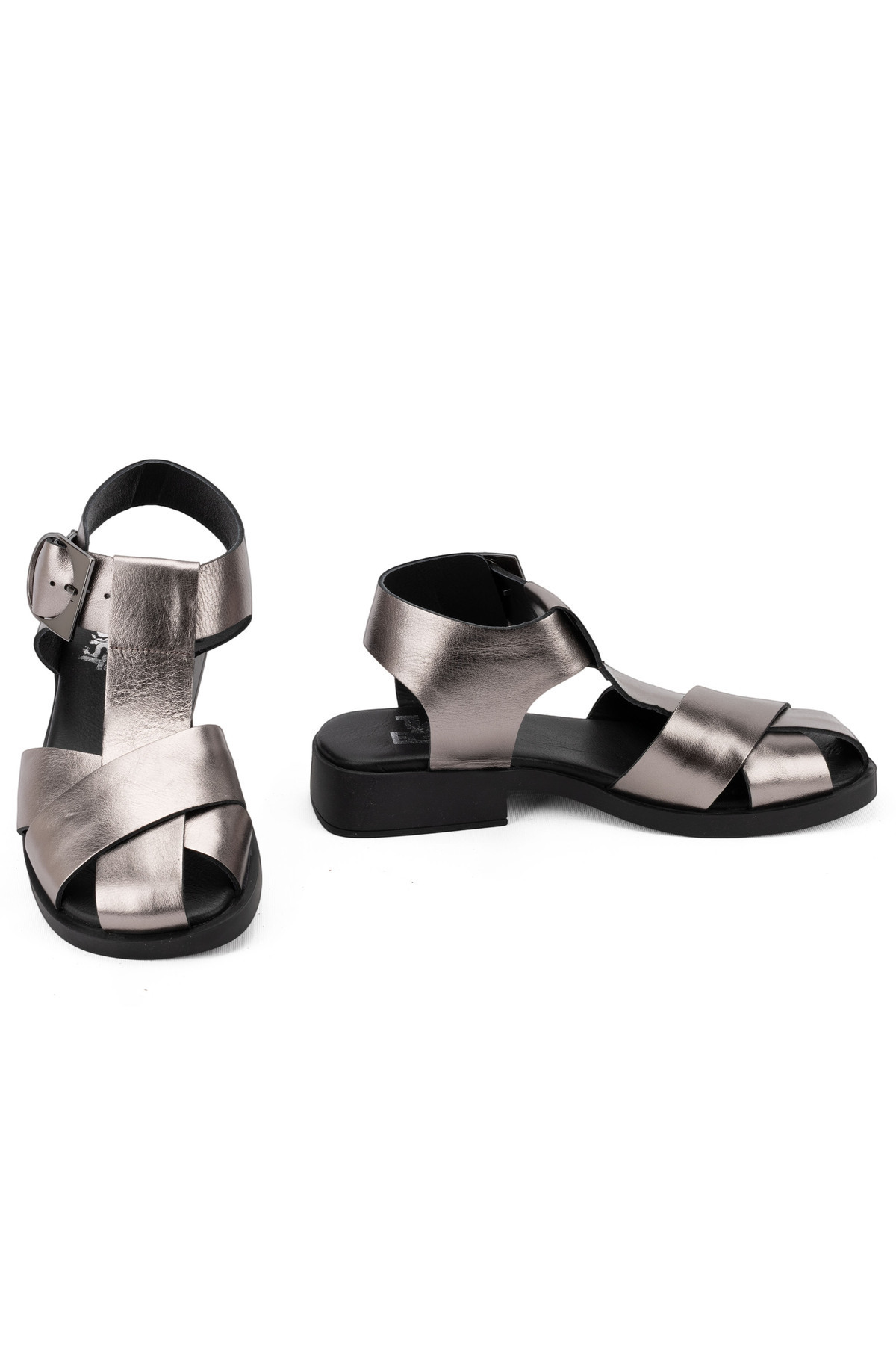 صندل زنانه چرم اصل گشاد، راحت و شیک، رنگ آنتراسیت متالیک