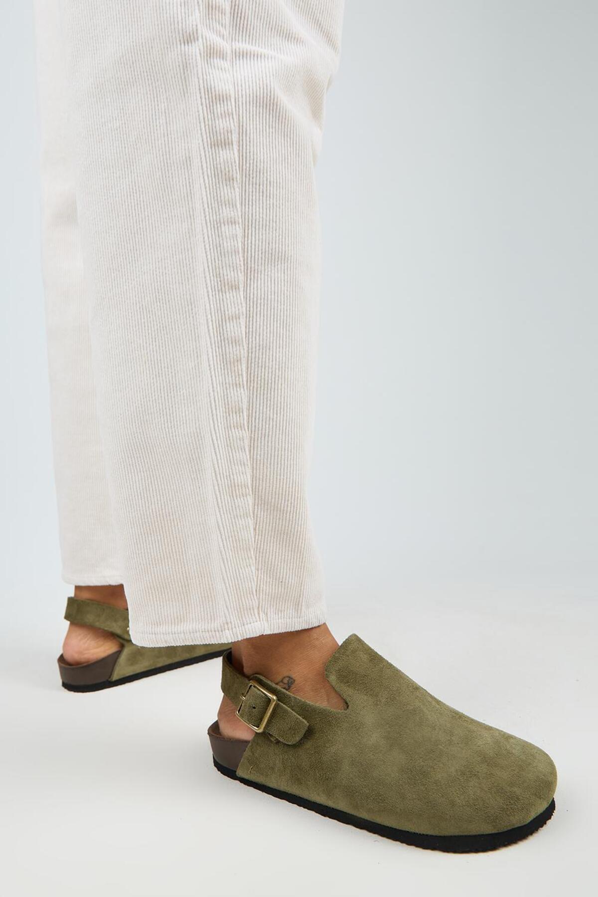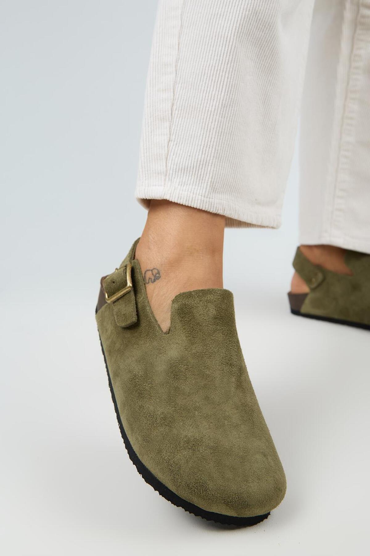 صندلهای چرمی اصل زنانهی هالی ۲، سگکدار، کمربنددار و خاکی رنگ