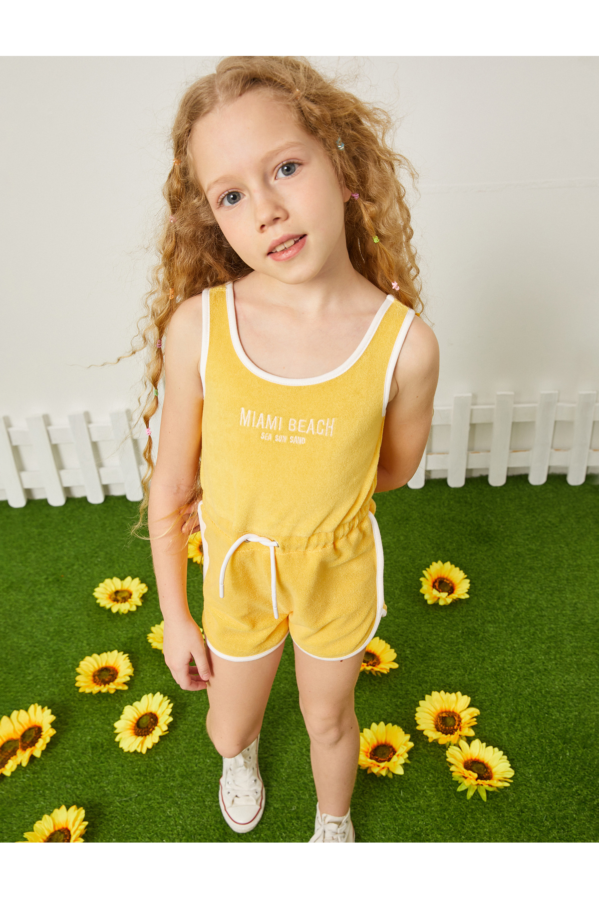 شلوارک سرهمی بدون آستین یقه گرد پارچهای تری کمر بسته
