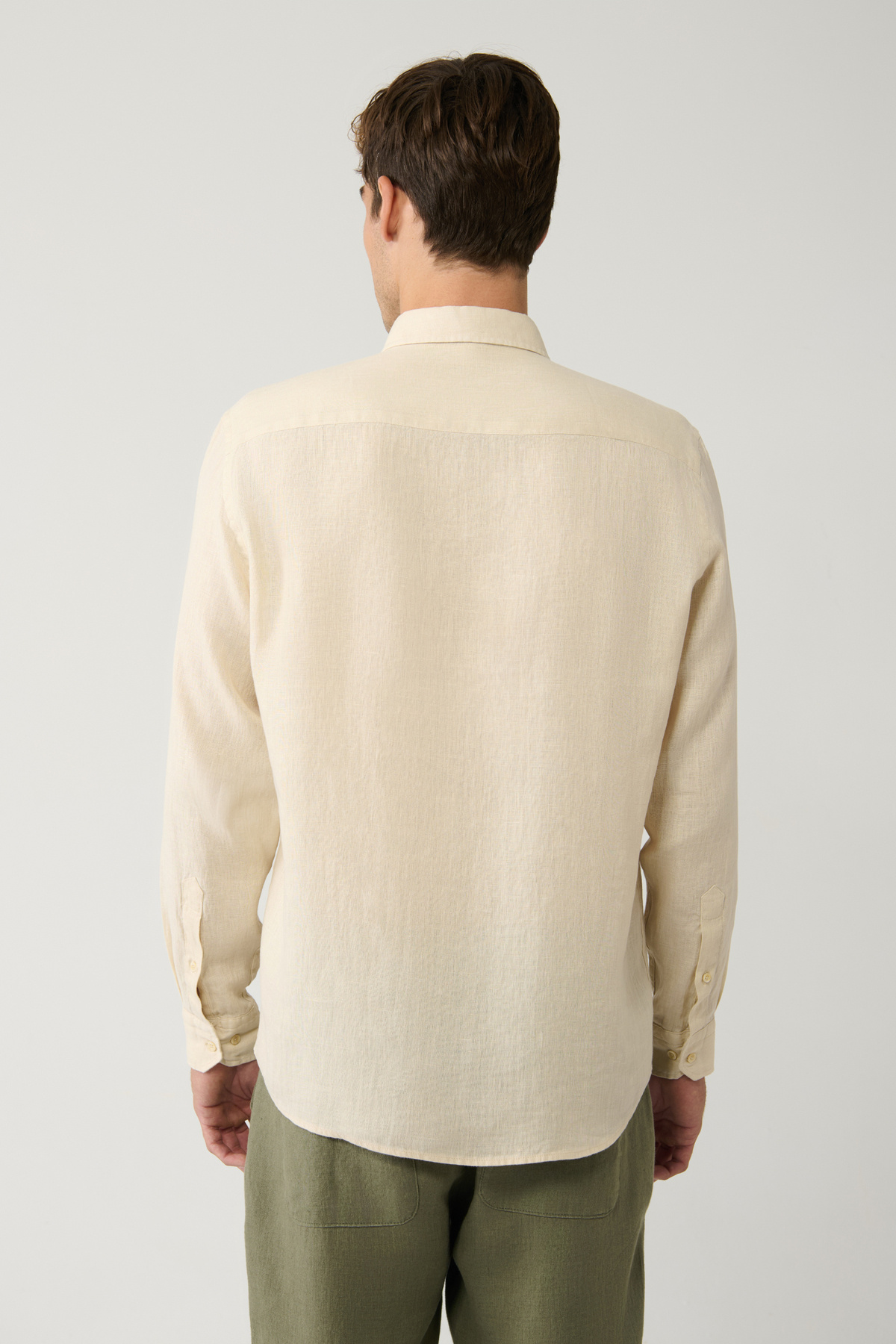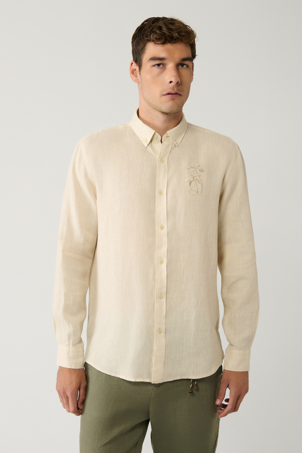 پیراهن مردانه یقه دکمهدار بژ، ۱۰۰٪ کتان، گلدوزی شده، مناسب برای راحتی A41Y2232
