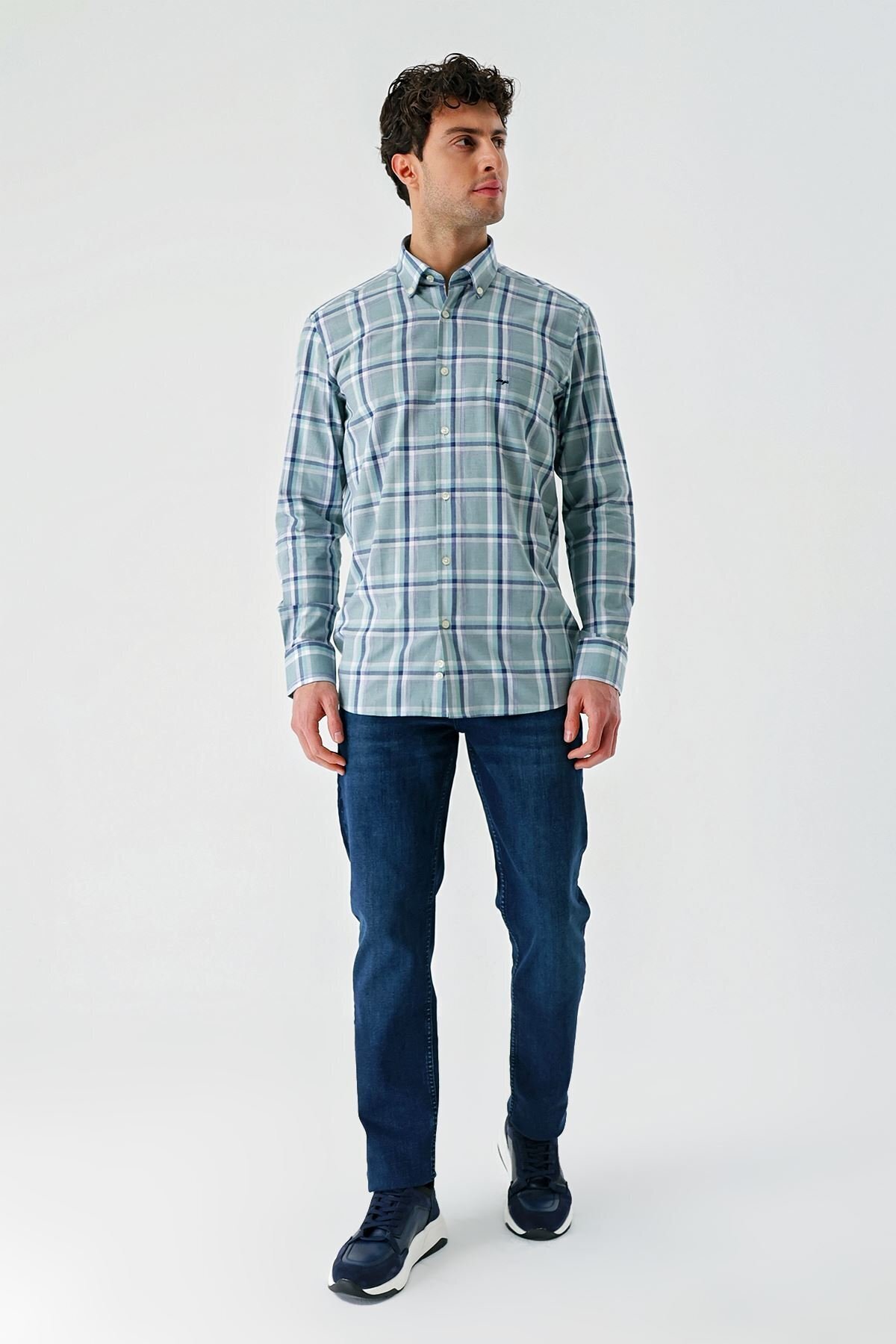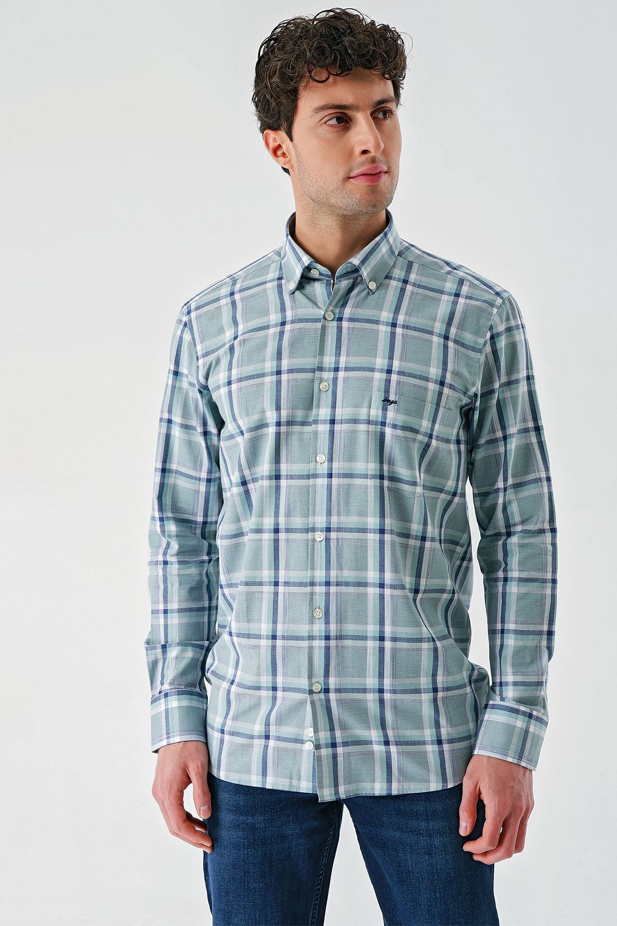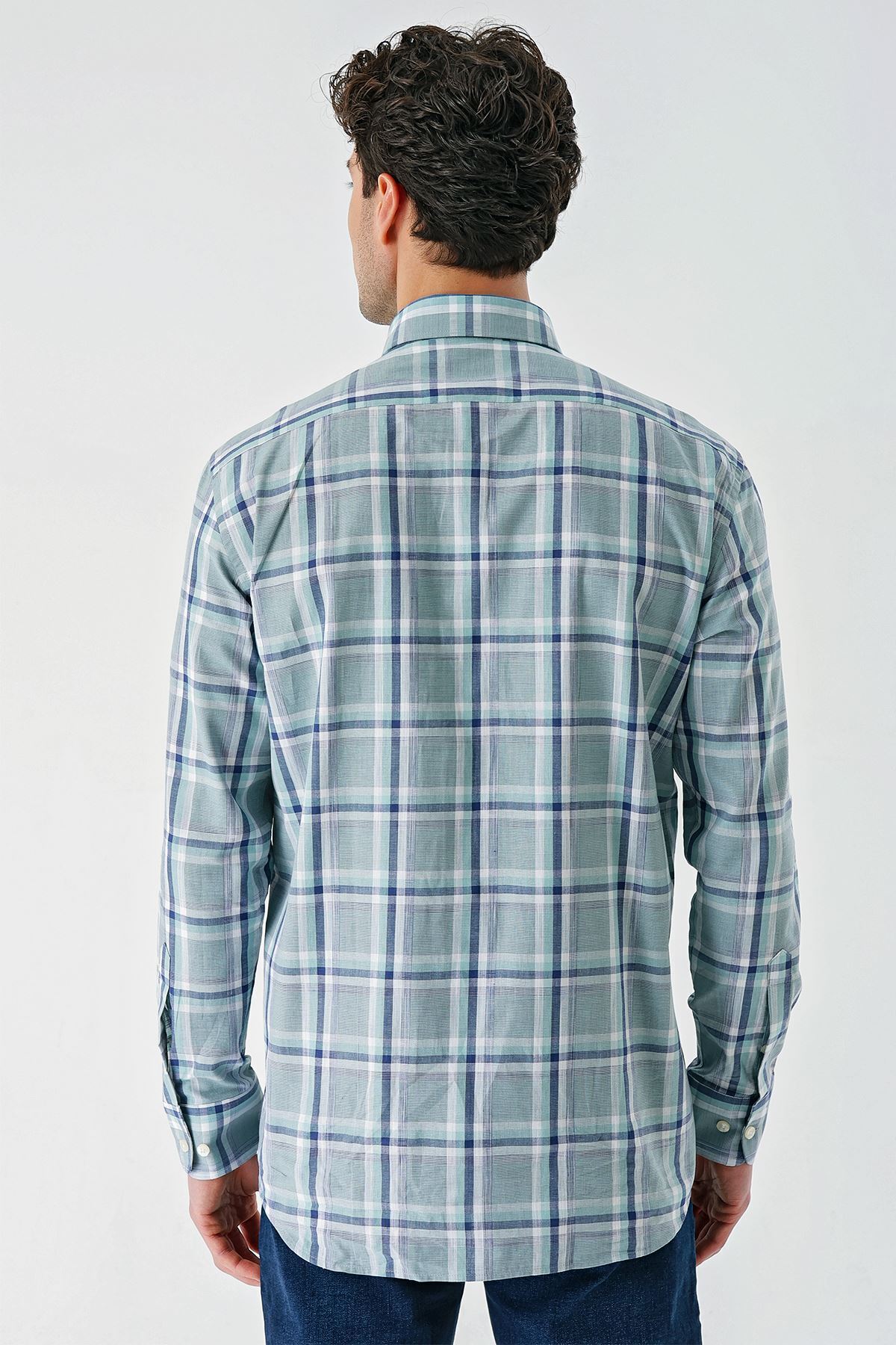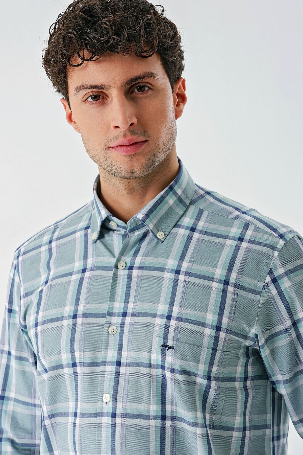 پیراهن آستین بلند چهارخانه جیبدار سبز آبی، 100% پنبه، فیت کلاسیک، برش آرام، کد 1004240184