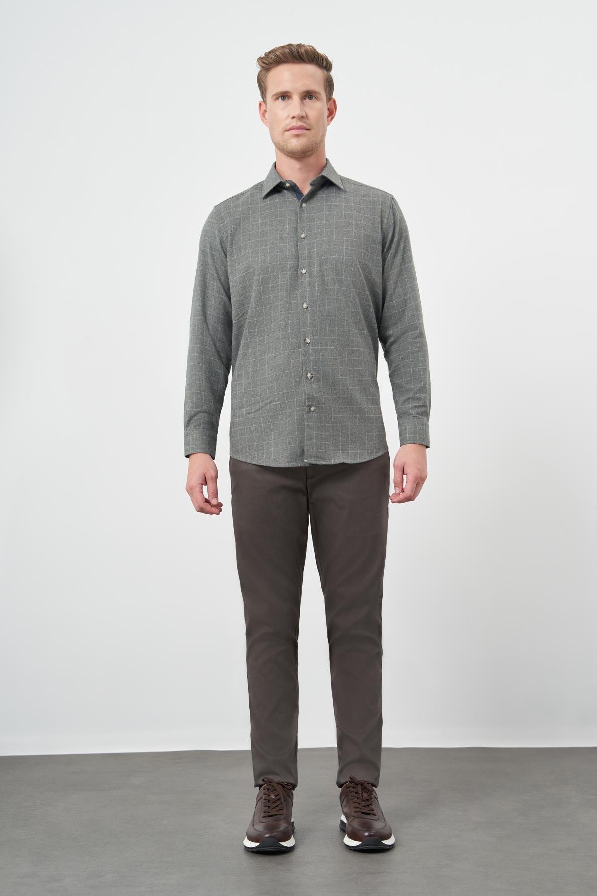پیراهن راحتی کلاسیک نخی بدون جیب گاباردین طرح چهارخانه آستین بلند خاکی تیره کد ۱۰۰۴۲۴۵۱۶۶