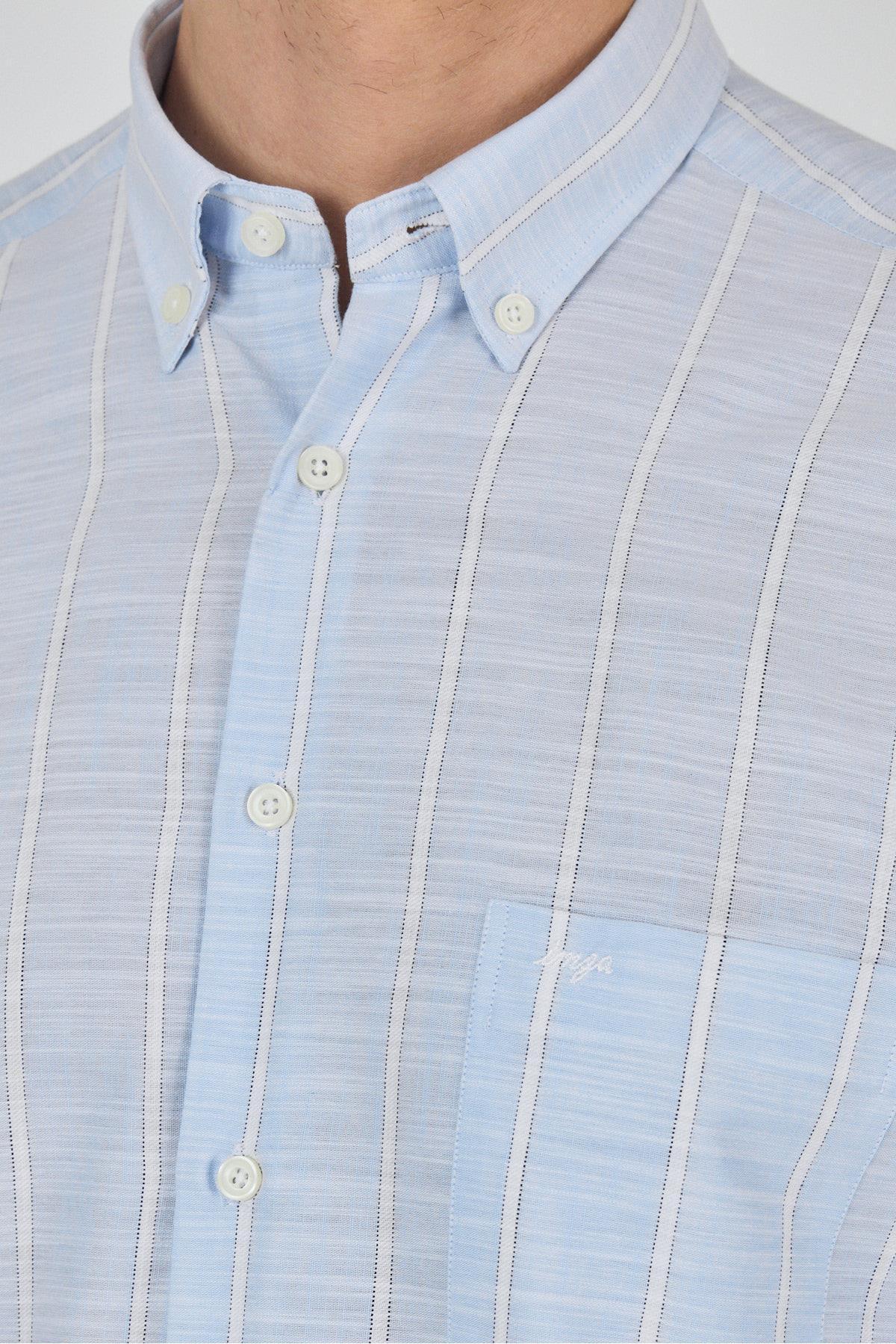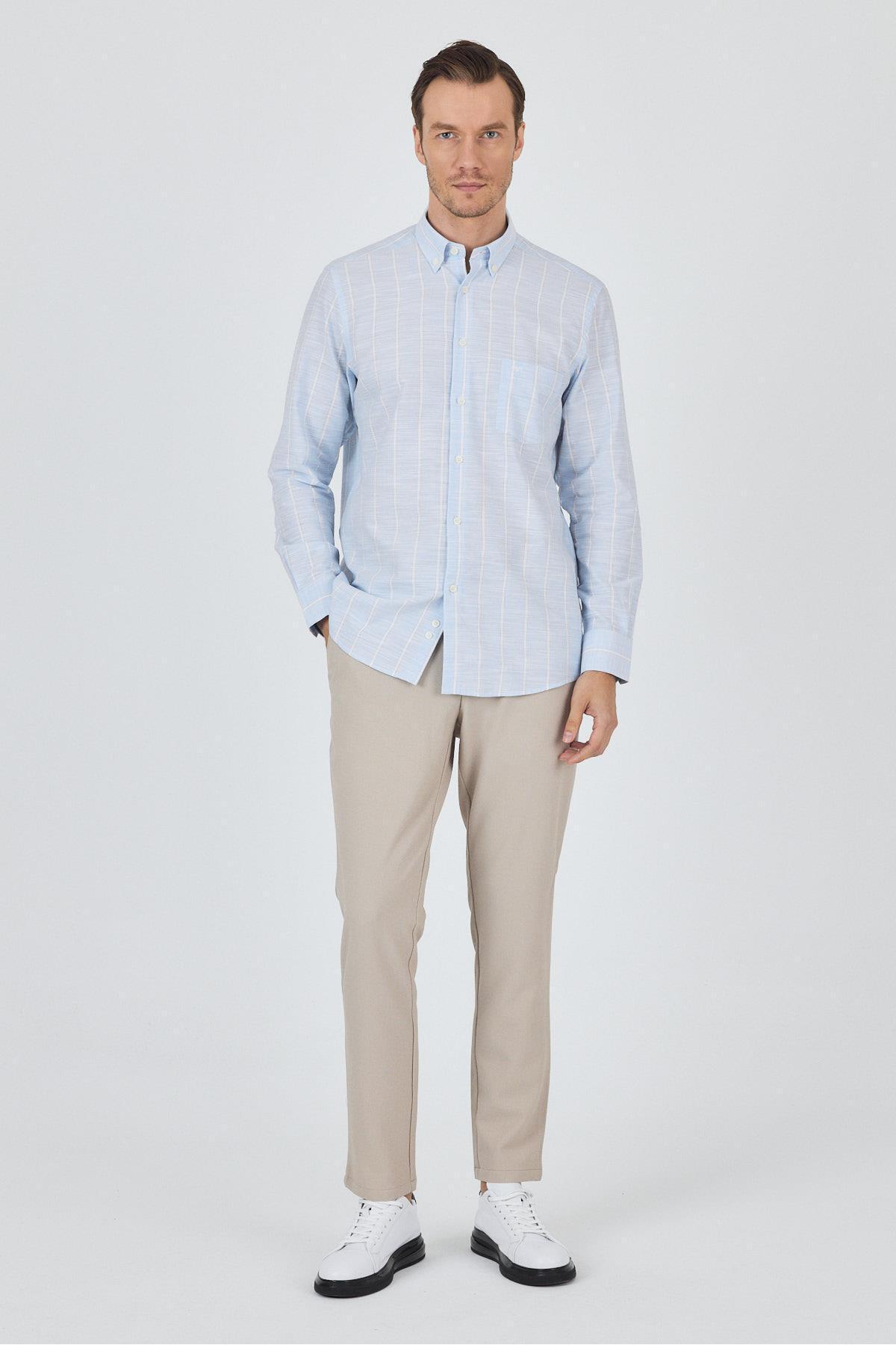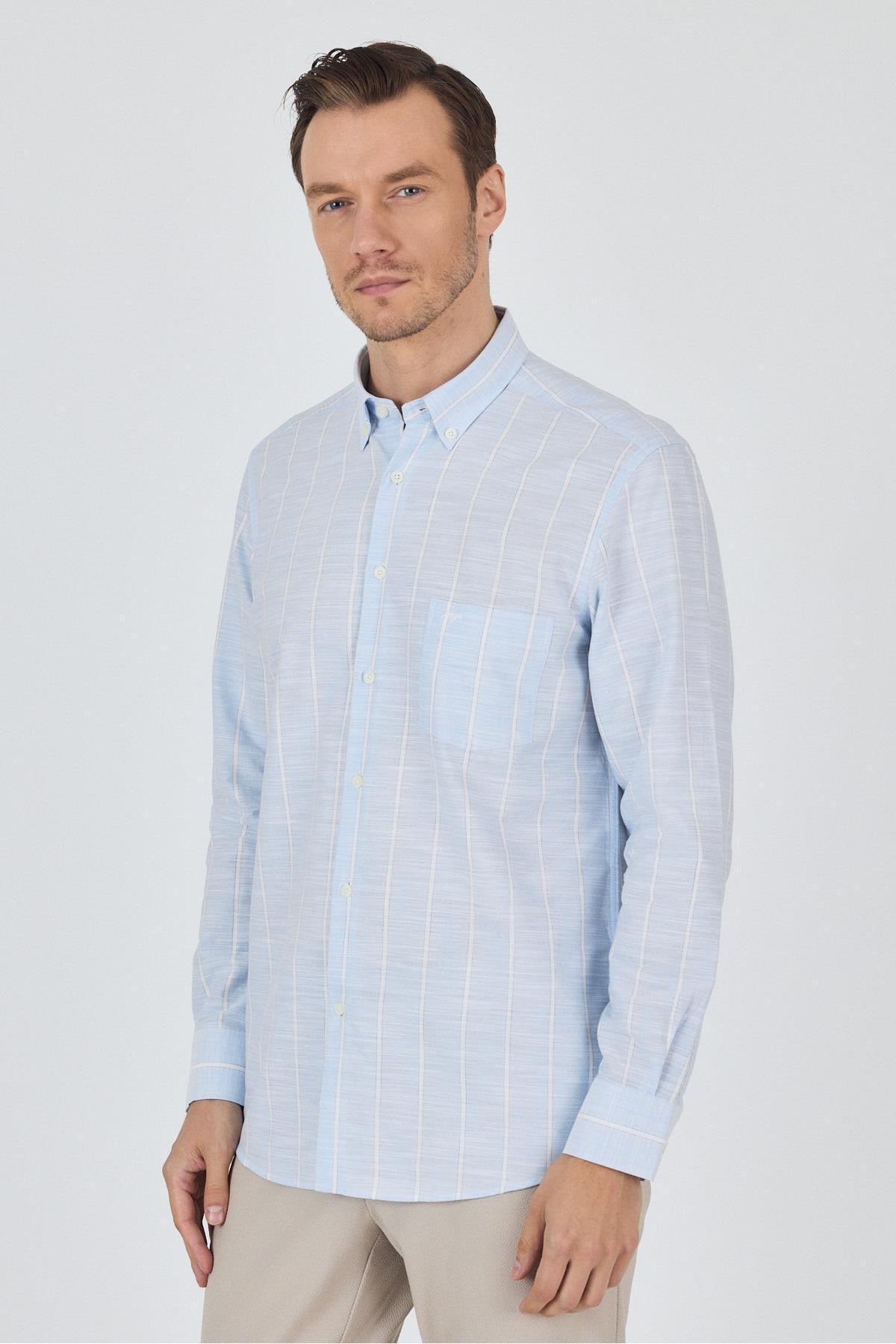 پیراهن آستین بلند راه راه یقه دکمه دار، جیب دار، کلاسیک، راحت و مناسب، کد 1004250189