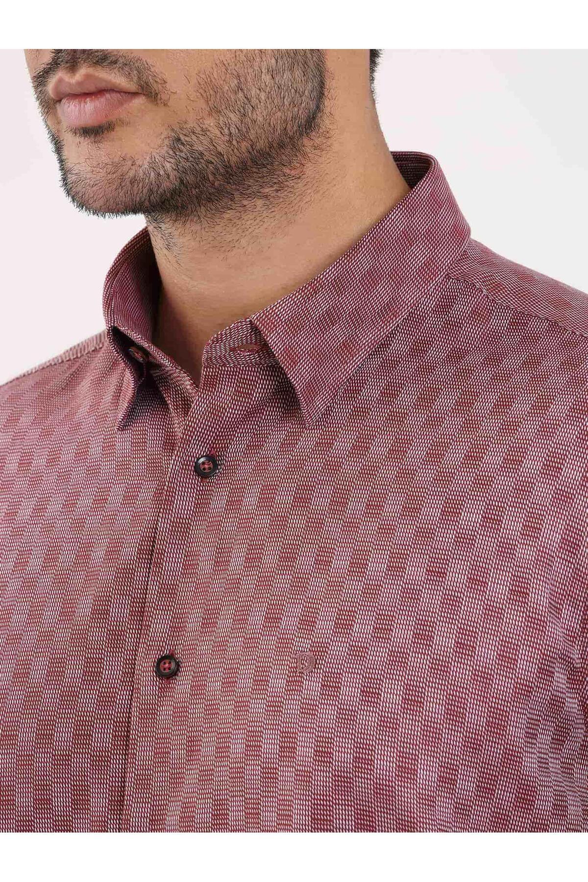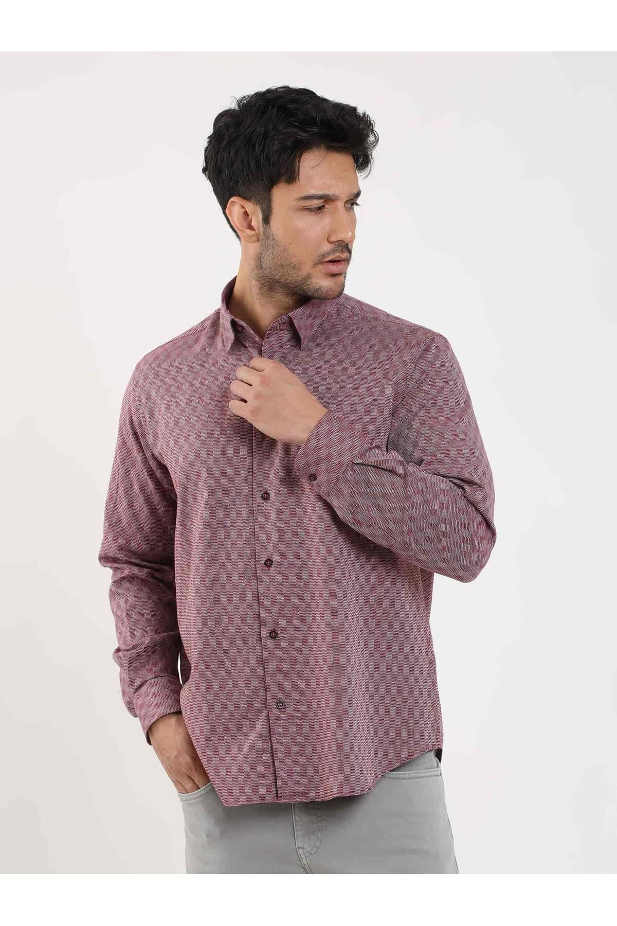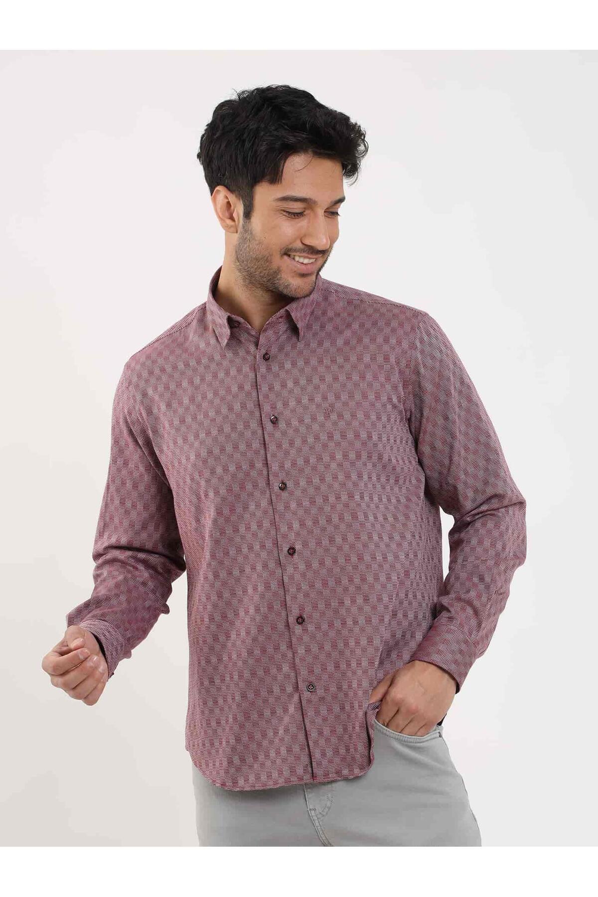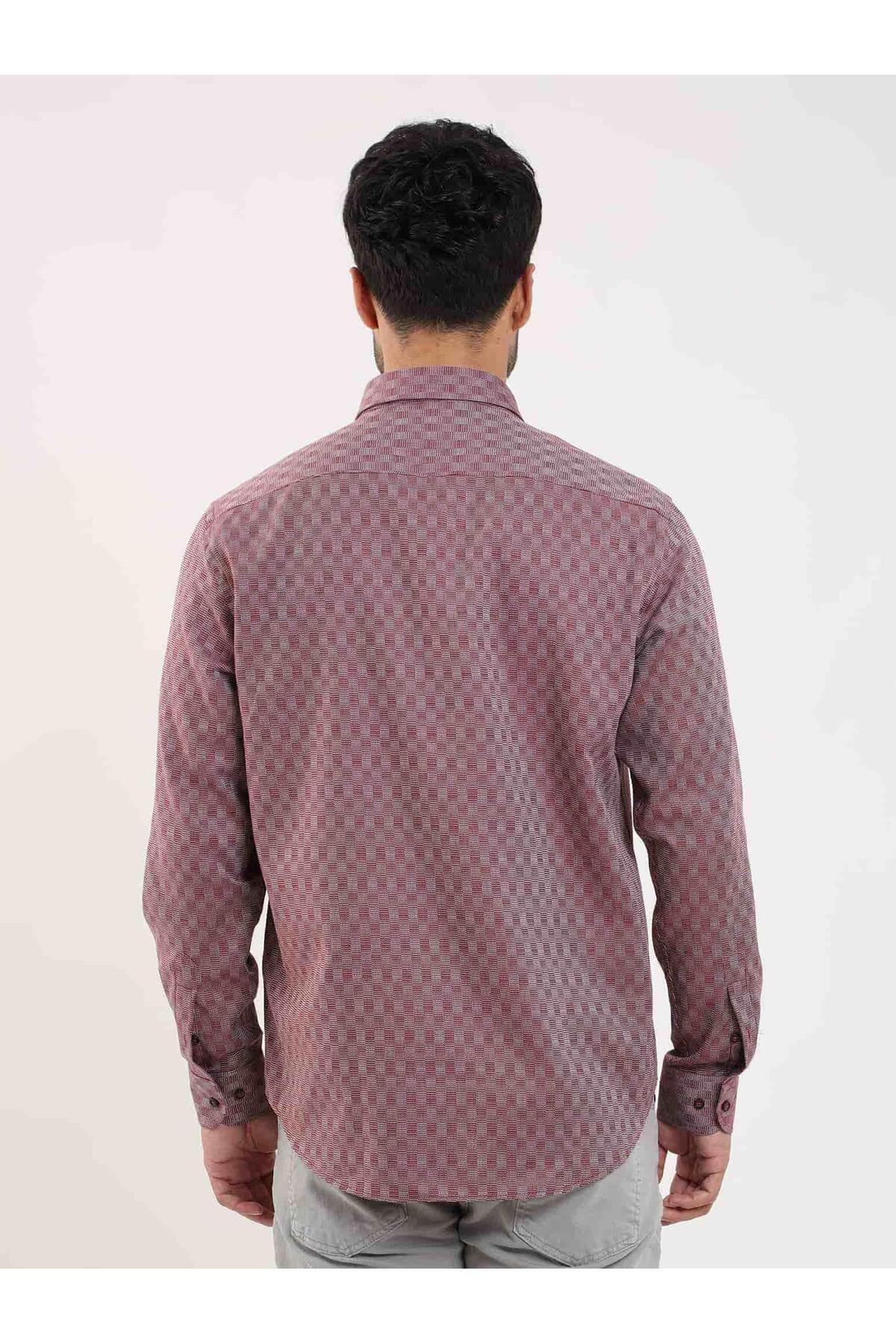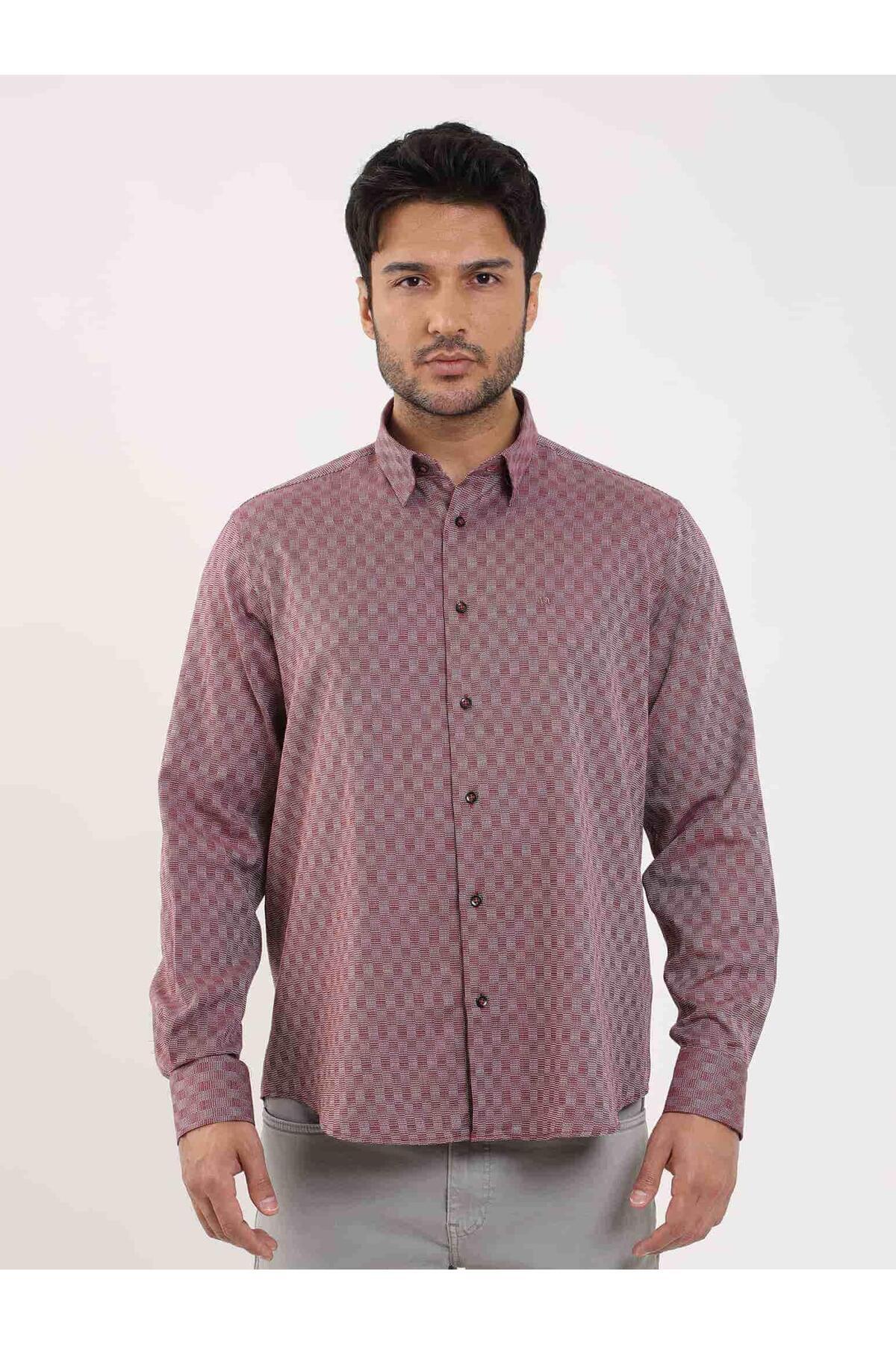 پیراهن مردانه طرحدار معمولی، یقه دکمهدار، آستین بلند، زرشکی