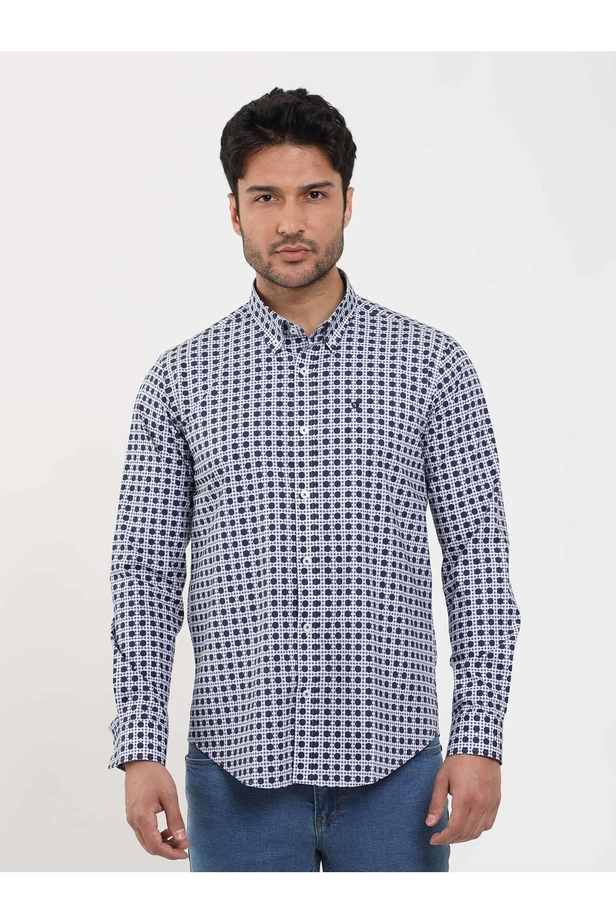 پیراهن مردانه آستین بلند یقه دکمه‌دار پولکا دات برنت سرمه‌ای اسلیم فیت
