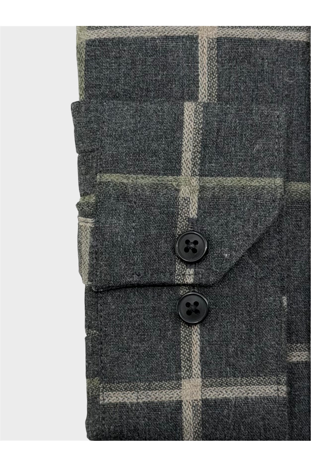 پیراهن مردانه زمستانی آستین بلند یقه دکمه‌دار تک جیب چهارخانه دودی کد ۳۸۴۵F
