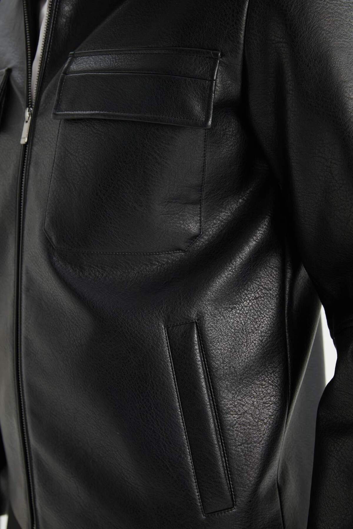 پالتو فصلی ضد آب، یقه پولو، اسلیم فیت، اسلیم کات، زیپ دار، ضد باد، چرم مصنوعی، دارای جیب داخلی