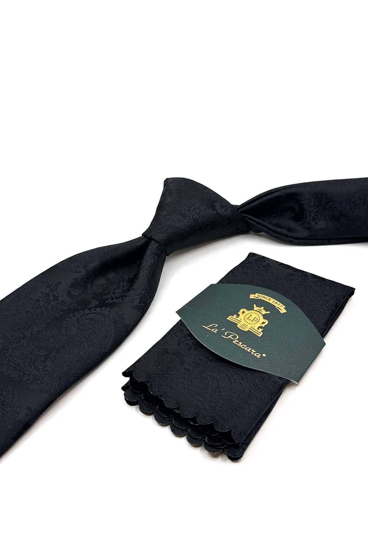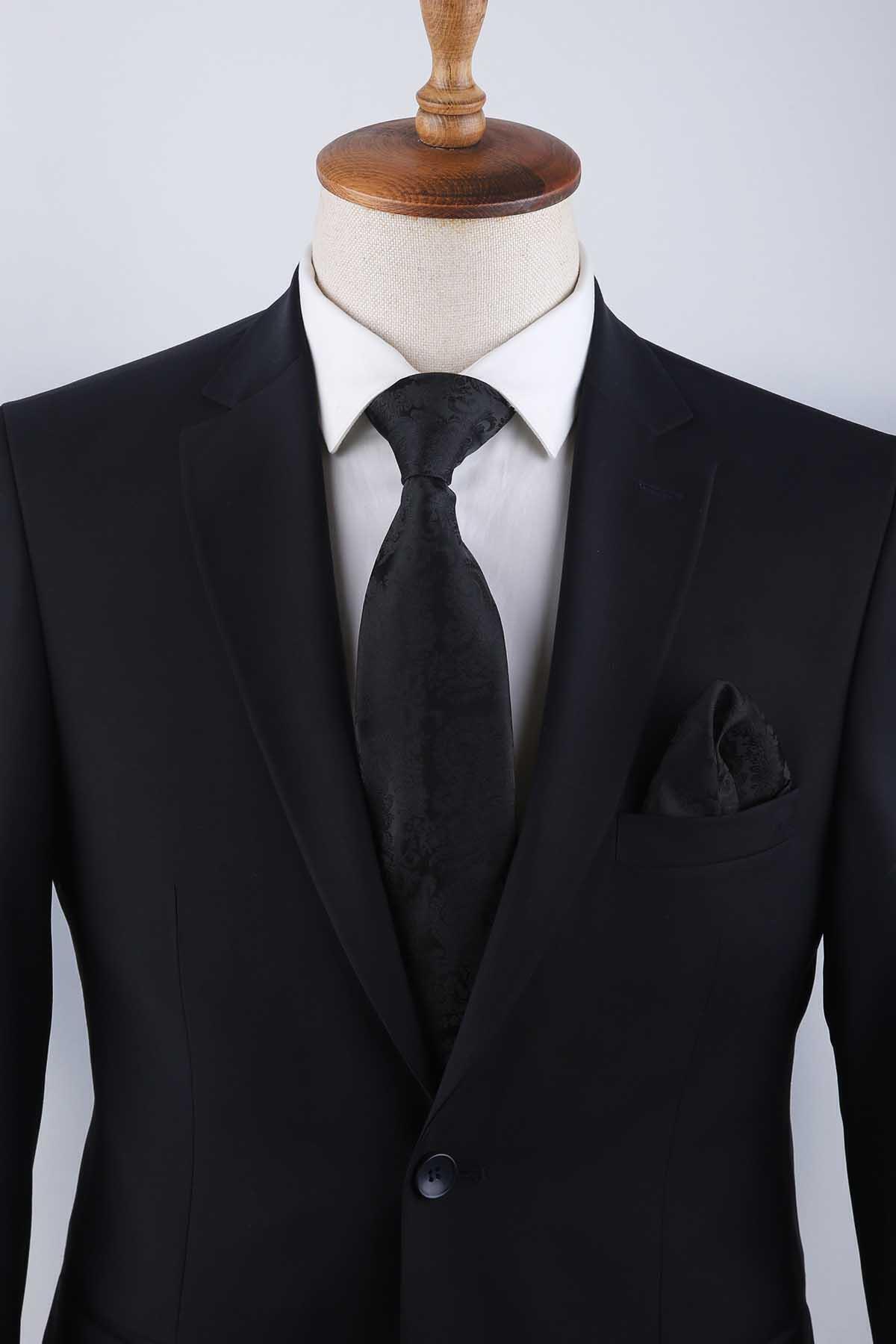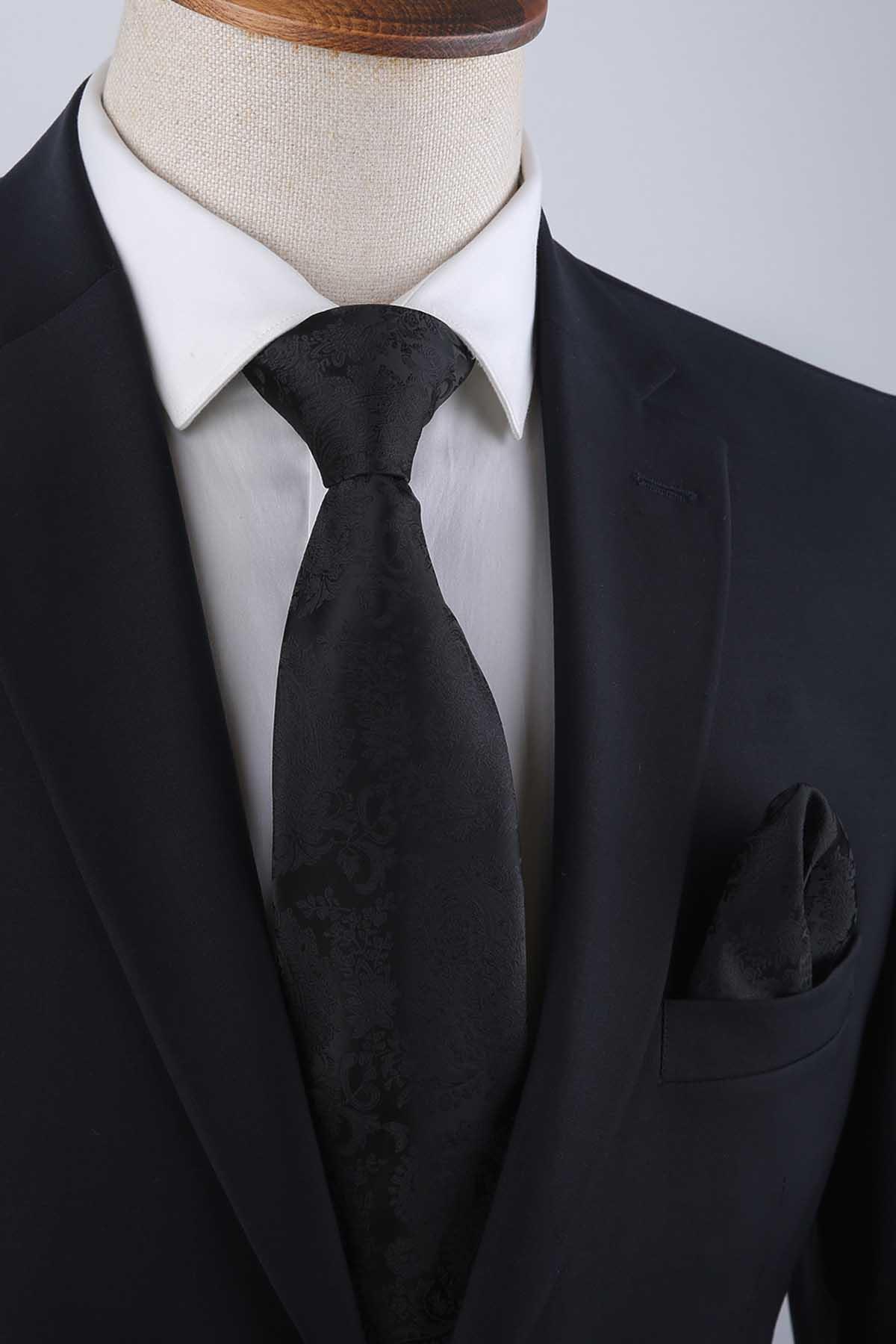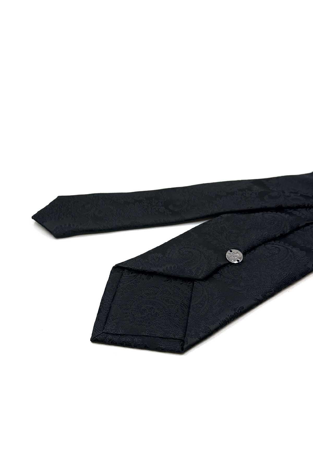 کراوات کلاسیک طرحدار مشکی طرح بتهجقه با دستمال جیبی KK13117