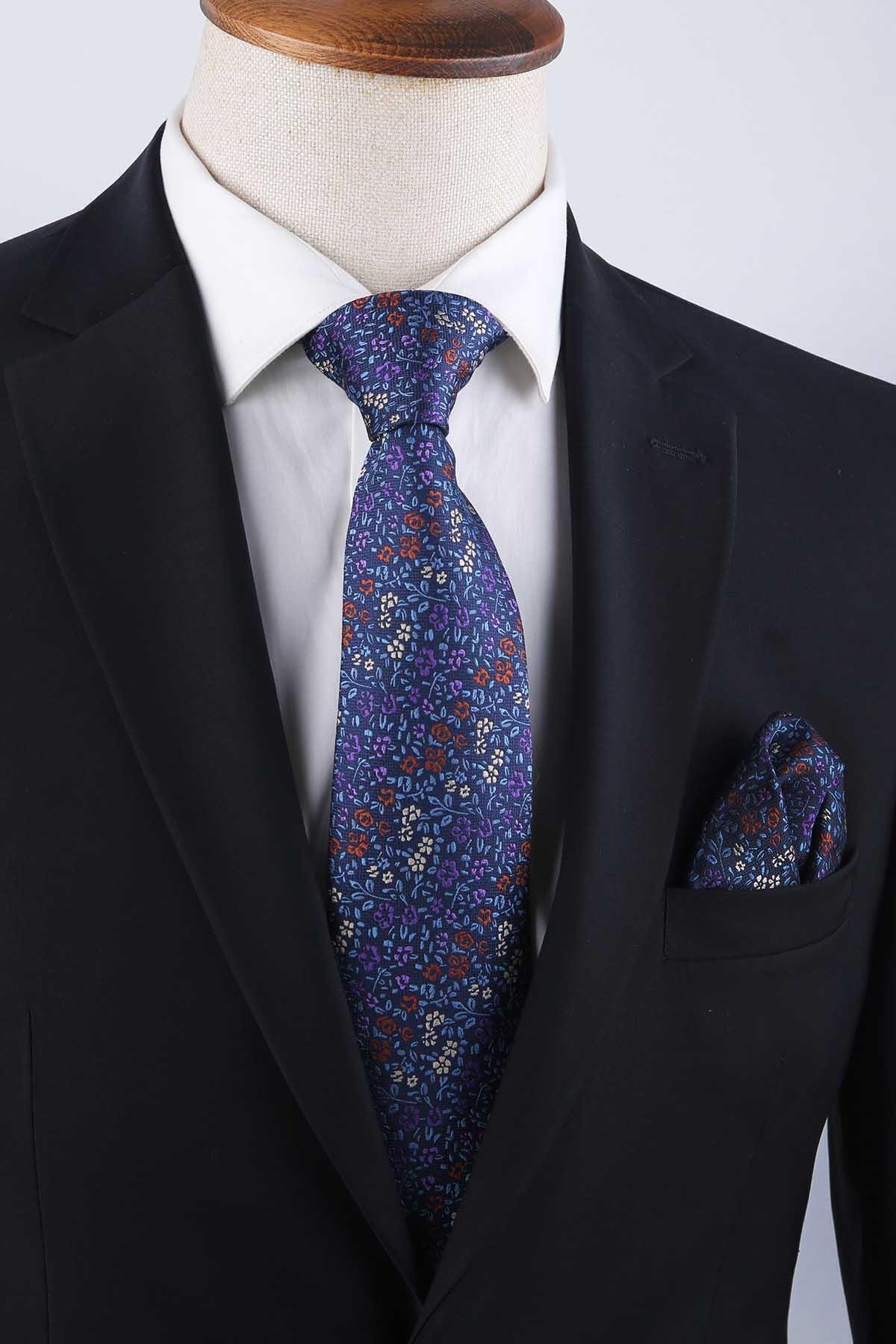 کراوات کلاسیک سرمهای با دستمال جیبی طرح گلدار KK13158