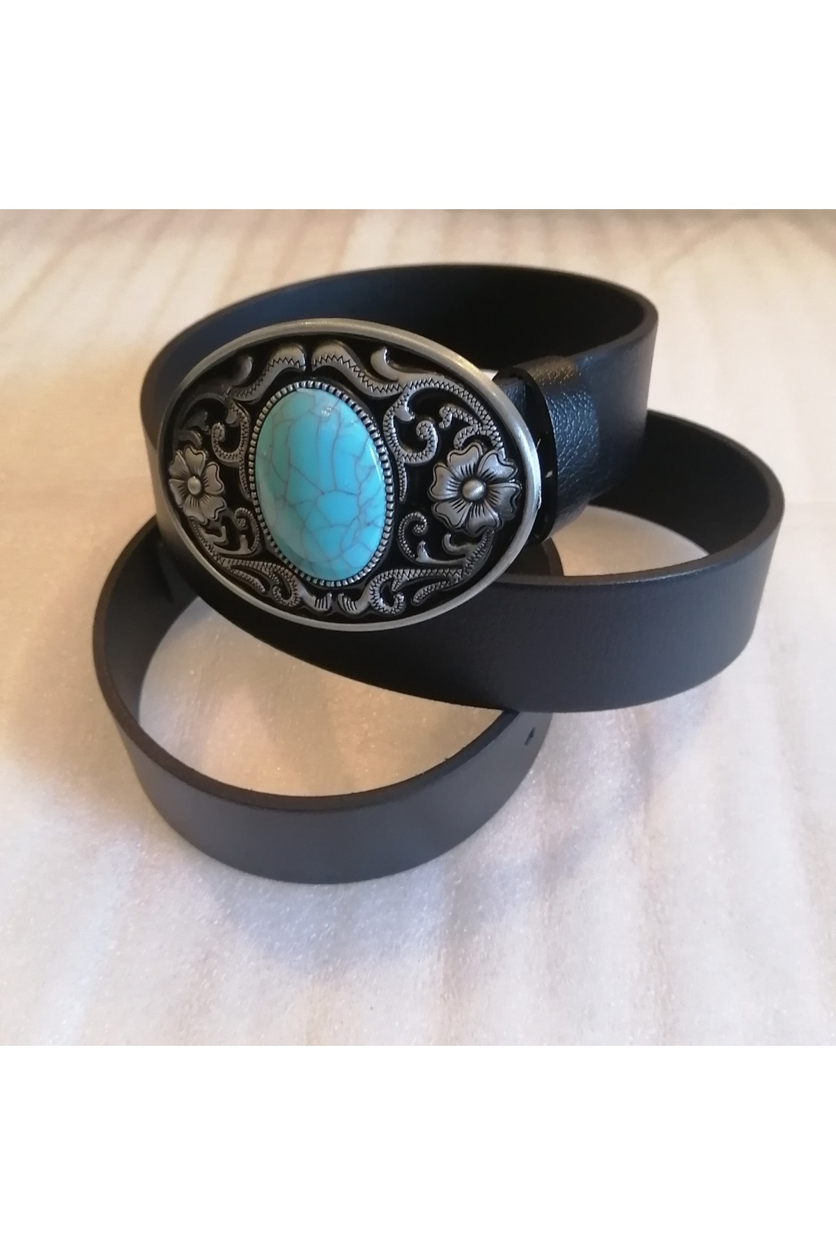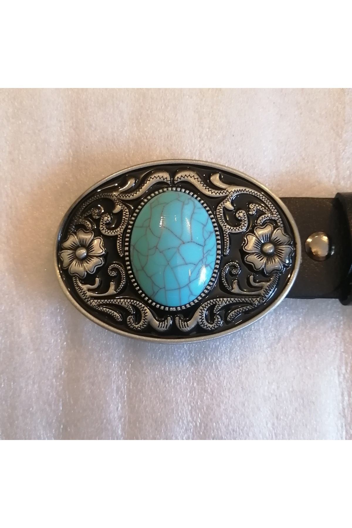 کمربند سگکدار کابویی طرح گلدار بزرگ از جنس چرم طبیعی مشکی، مناسب برای هر دو جنس، ساخت تایلند